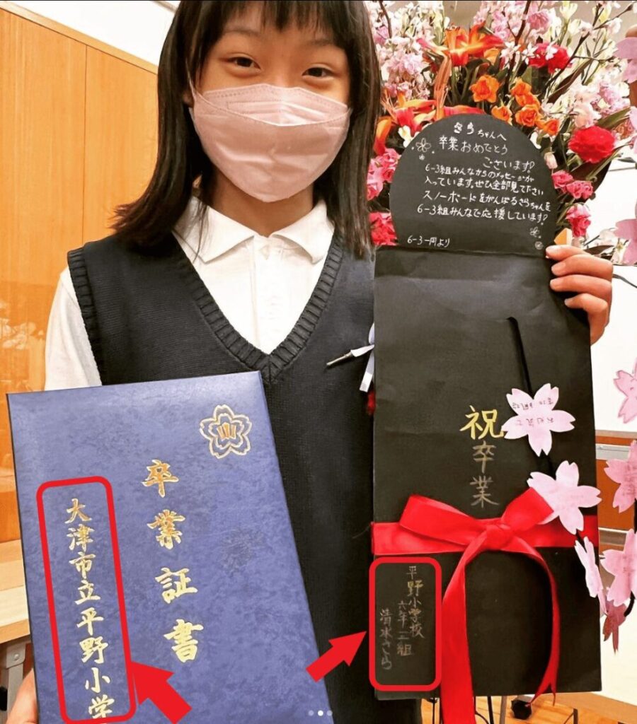 また、清水さらさんがSNSに卒業証書をもっている写真を投稿しており、その卒業証書にも平野小学校と記載されていました。⇓⇓