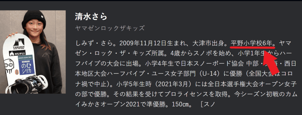 清水さらさんが平野小学校の6年生であると、滋賀のスポーツ&教育情報WEBマガジンの紹介文に記載がありました。⇓⇓