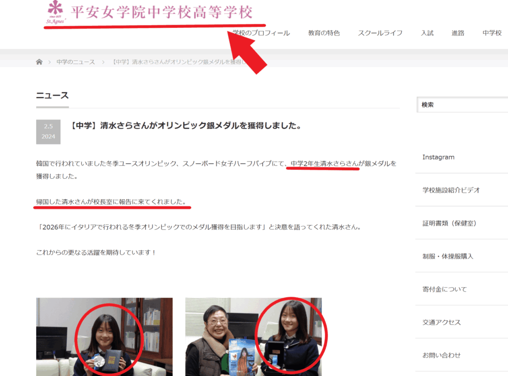 中学校のホームページに記載があり、清水さらさんが平安女学院中学校に在籍していることが確認できます。⇓⇓