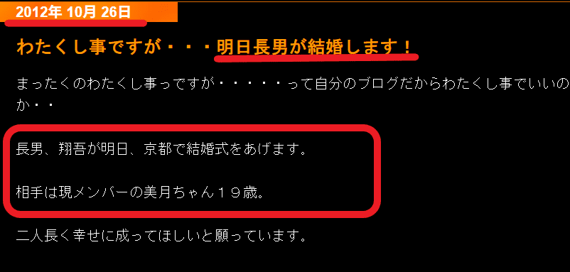 2012年10月27日に、京都の全日空ホテルで結婚式を挙げたそうです。